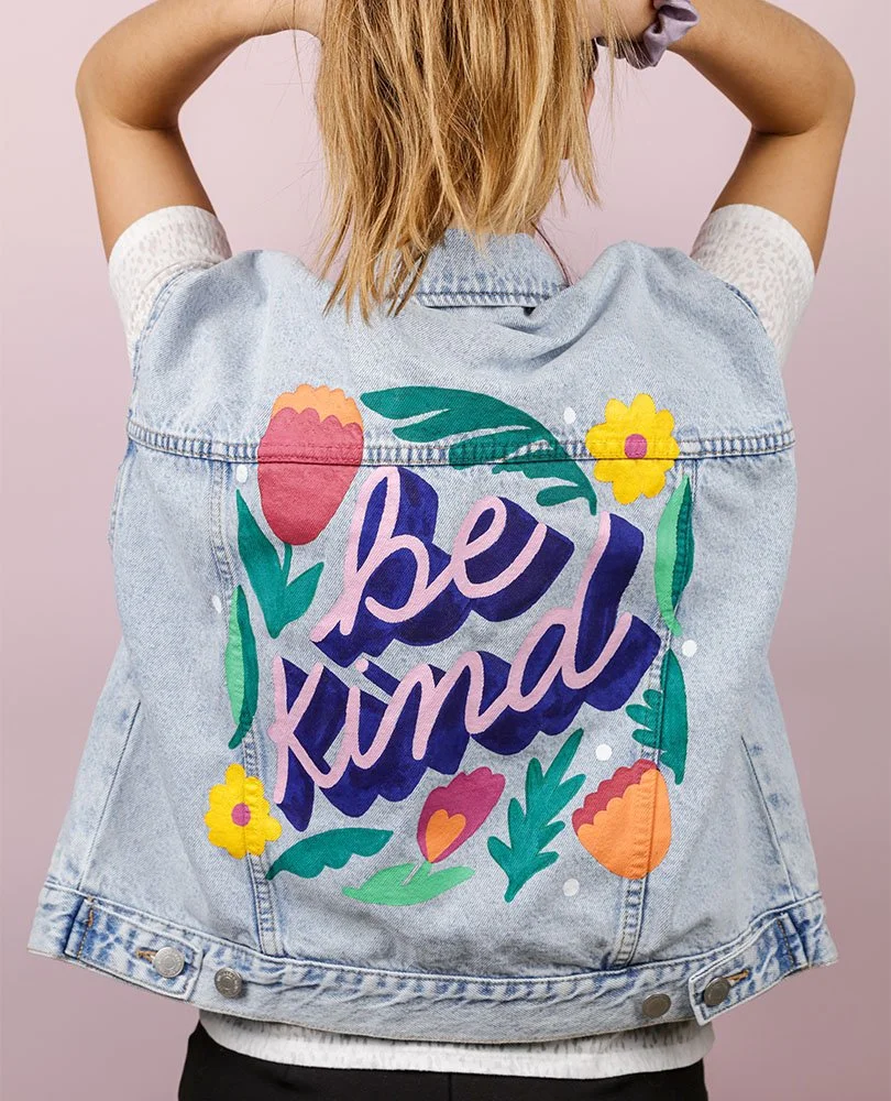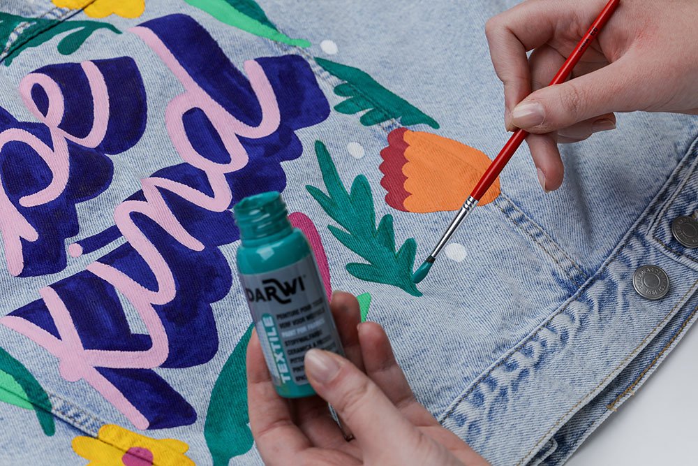 Painting on 4 products to showcase 4 types of paint from the Darwi brand (leather, ceramic, acrylic, and textile paints). Illustrations and lettering done on shoes, plates, denim jackets, and terracotta pots. The colorful and 100% good vibes designs were photographed and then incorporated into the 2024 catalog.