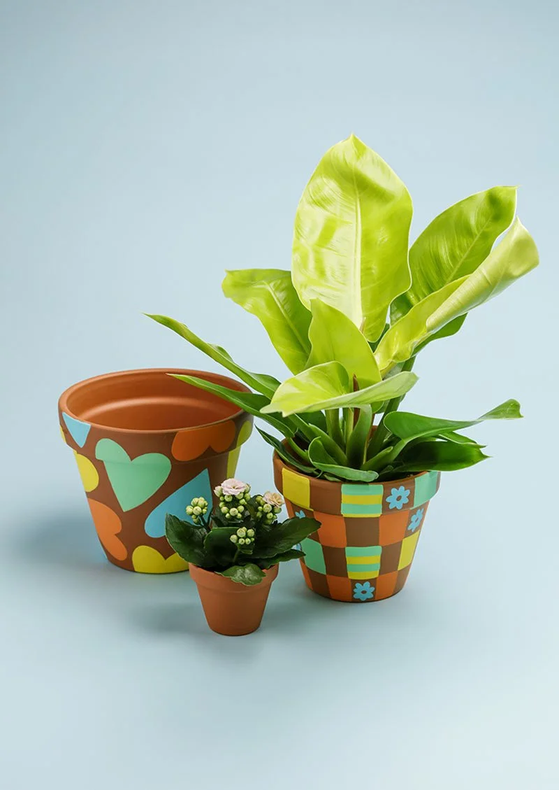 Peinture sur 4 produits pour mettre en avant 4 types de peinture de la marque Darwi (cuir, céramique, acrylique et textile). Illustrations et lettrages réalisés sur des chaussures, assiettes, veste en jean et pots en terre cuite. Les designs colorés et 100% good vibes ont été pris en photo, puis incorporés dans le catalogue 2024.