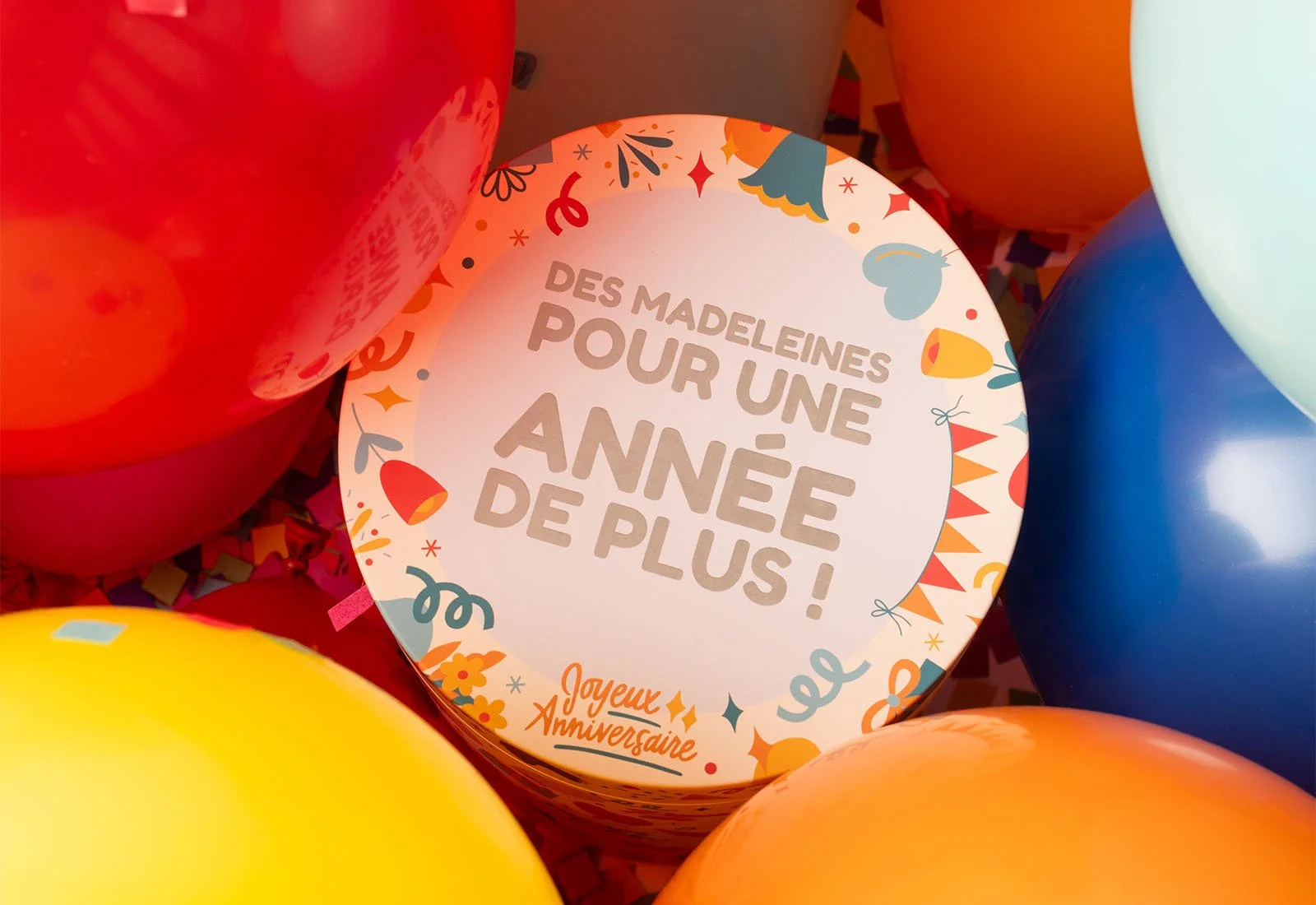 Création du packaging d’une boite de madeleines Maison Colibri (deux tailles). La collection permanente « Anniversaire » est parfaite pour offrir ses souhaits d’anniversaire avec une touche gourmande.