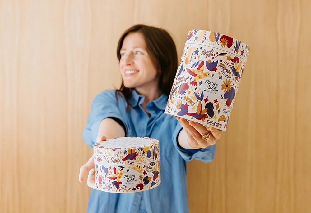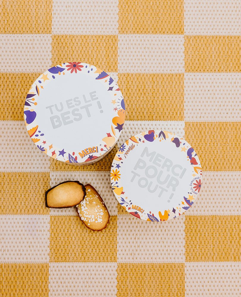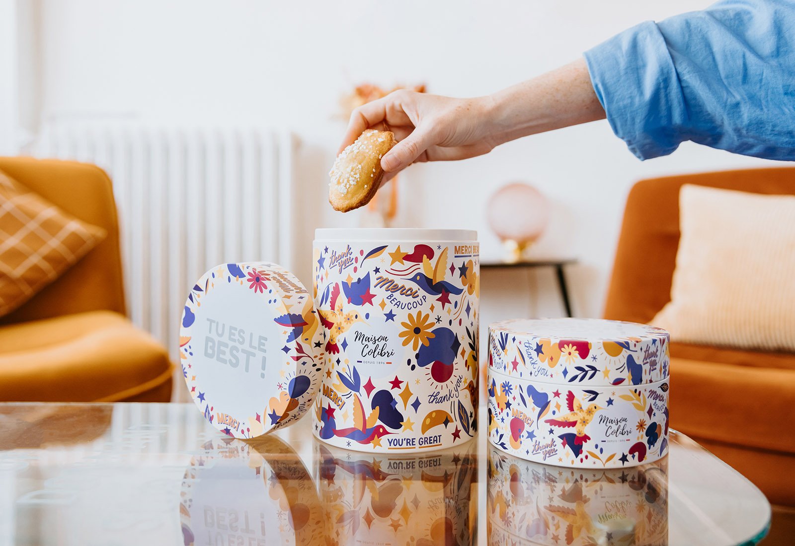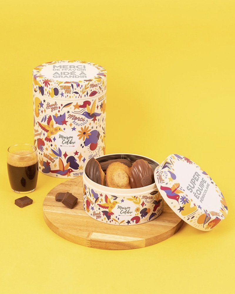 Creation of the packaging for a Maison Colibri madeleine box (two sizes). The permanent “Merci” collection aims to show gratitude to those who accompany us in everyday life, such as nannies and teachers.