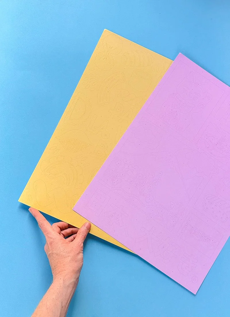 The drawings are printed with a light guide pattern of dots, making the coloring process easier and more fluid. An editorial illustration project combining graphic design, hand lettering, and printed product design.