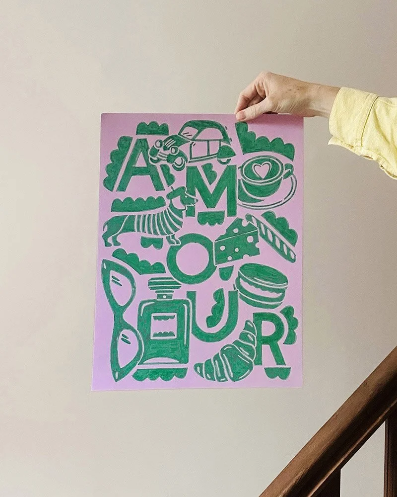 Les dessins sont imprimés en trame légère avec points guides, pour faciliter le coloriage et rendre l’expérience plus fluide. Un projet d’illustration éditoriale qui mêle design graphique, typographie illustrée et création d’objet imprimé.