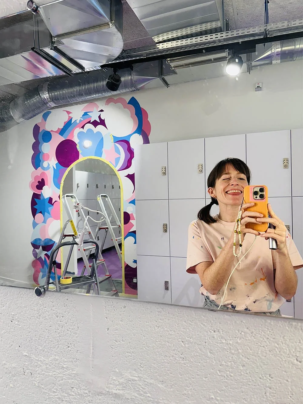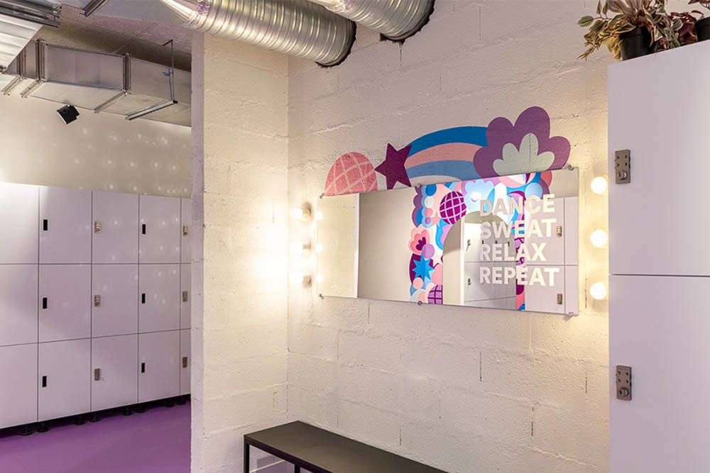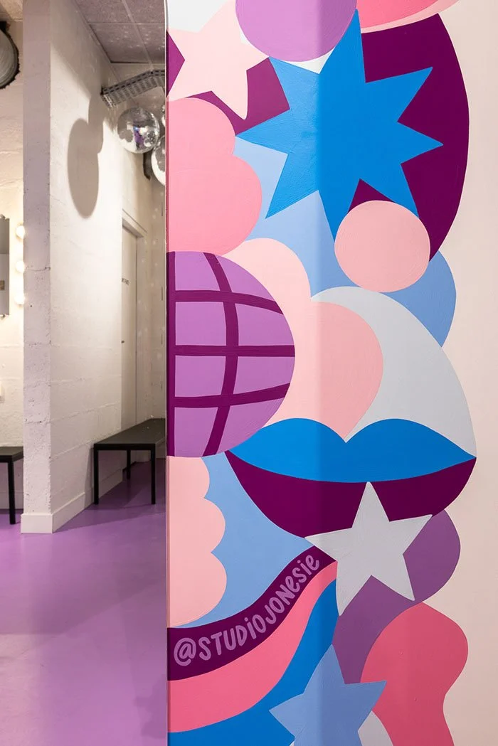 The sparkly, energetic color palette reflects my signature style while perfectly complementing Dancefloor’s brand identity. Completed in June 2024, this mural adds a bold and dynamic touch to the studio’s interior, enhancing the atmosphere for dancers and visitors alike.