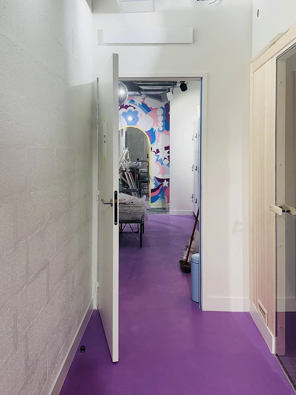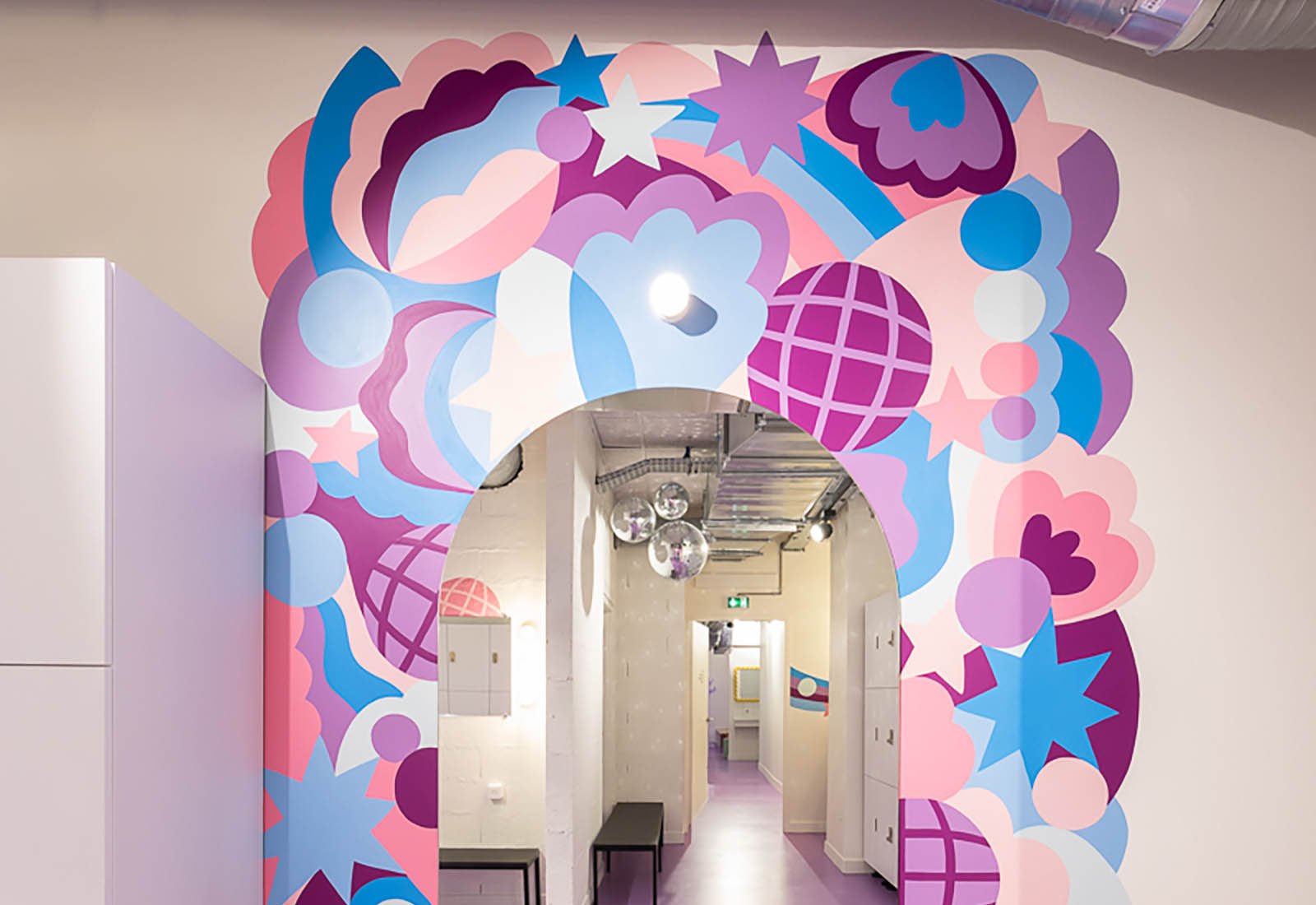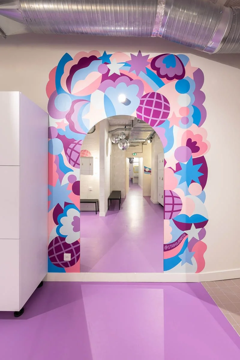 I had the pleasure of creating a vibrant 2m x 3m mural for Dancefloor Paris, the newest dance studio in the city’s 8th arrondissement. The brief encouraged creativity and fun, so I designed a playful composition featuring disco balls, lips, stars, and flowers subtly hidden among fluid, abstract shapes.