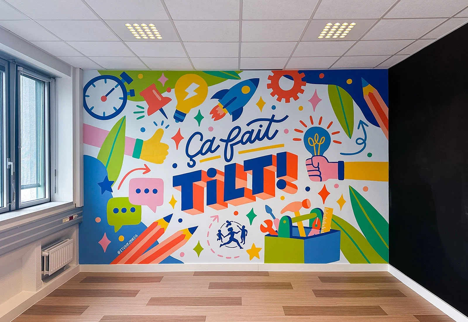 Le design, à la fois ludique et professionnel, s’articule autour du mantra de l’équipe, « Ça fait TILT ! », qui en constitue le point central. Des icônes emblématiques de la vie de bureau (ampoule, crayons, bulles de dialogue, etc.) se mêlent harmonieusement à des éléments plus personnels de mon travail, tels que des feuilles, des étoiles, et de petits points. Le design a été projeté sur le mur à l’aide d’un vidéo-projecteur pour être reproduit fidèlement.
