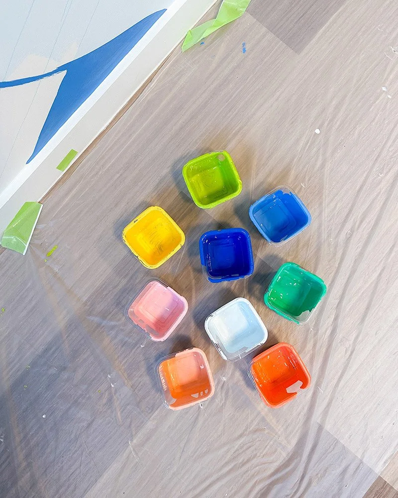 Fresque murale colorée et joyeuse (4,18 m x 2,60 m) peinte dans une salle de créativité et de réunion au sein des locaux de la CPAM à Lille-Douai.