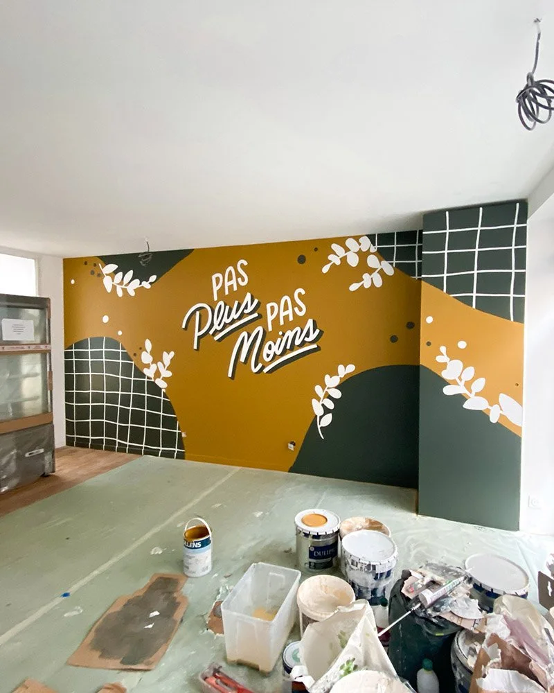 The slogan “Pas plus, pas moins” (Not more, not less) is highlighted by elegant botanical illustrations created in line with the brand’s graphic charter and a lovely 3D lettering. The design was transferred to the wall using a video projector. May 2021.