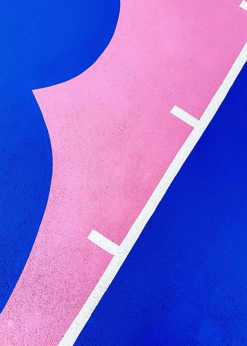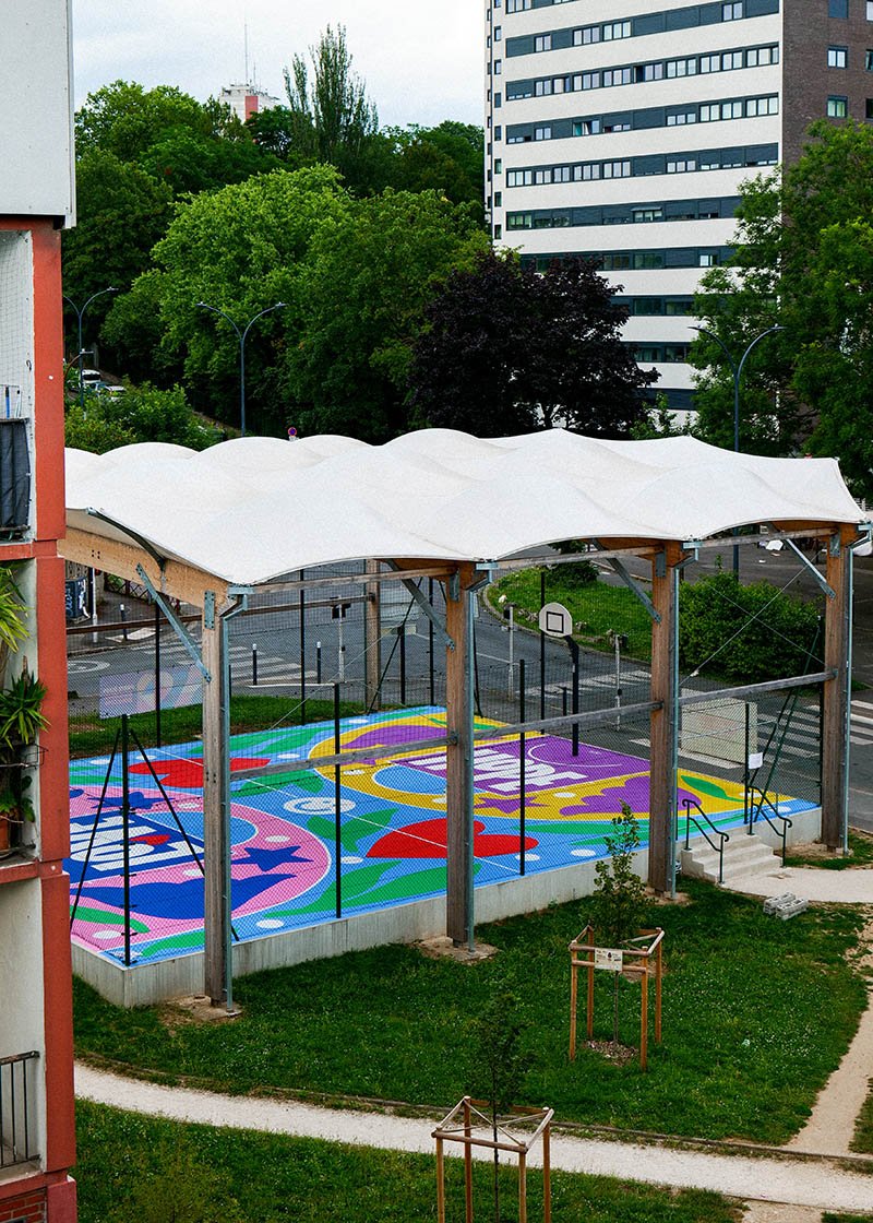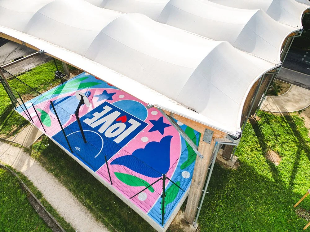 A 240 m² (14m x 17m) ground mural and my first painted sports court. In collaboration with the City of Montreuil and the agency Peint à la Main, I created this mural on a street basketball court, following a relatively open creative brief titled “Girl Power.”