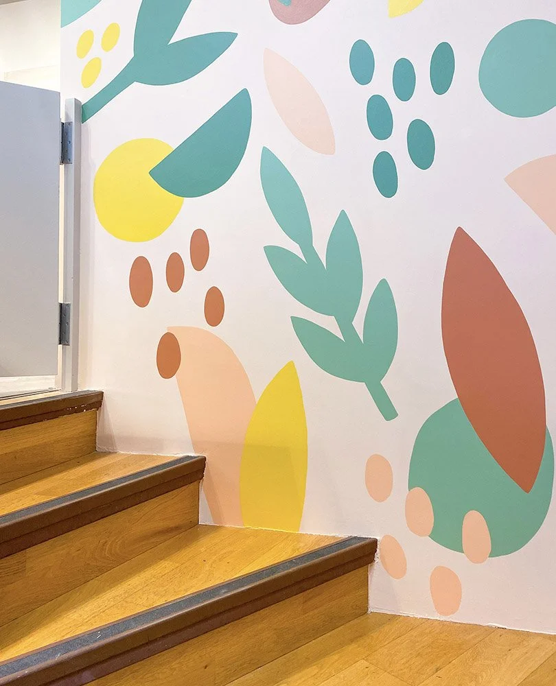 A 1.6m x 2.7m mural created to decorate the Olivolga boutique located in Paris’ 6th district. The 3D lettering complements the brand’s slogan, “Osez la créativité” (Dare to be creative). The botanical drawings adorn the boutique’s walls with warm colors. The design was transferred to the wall using life-sized prints and transfer paper.