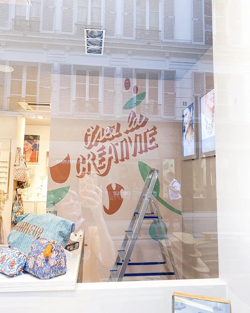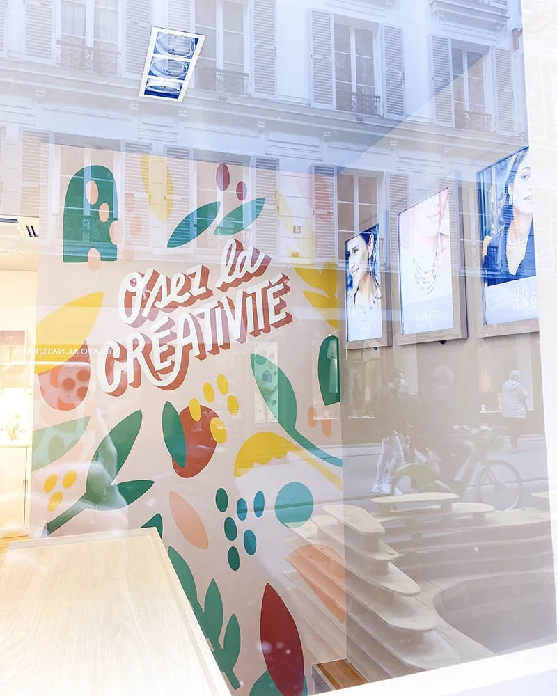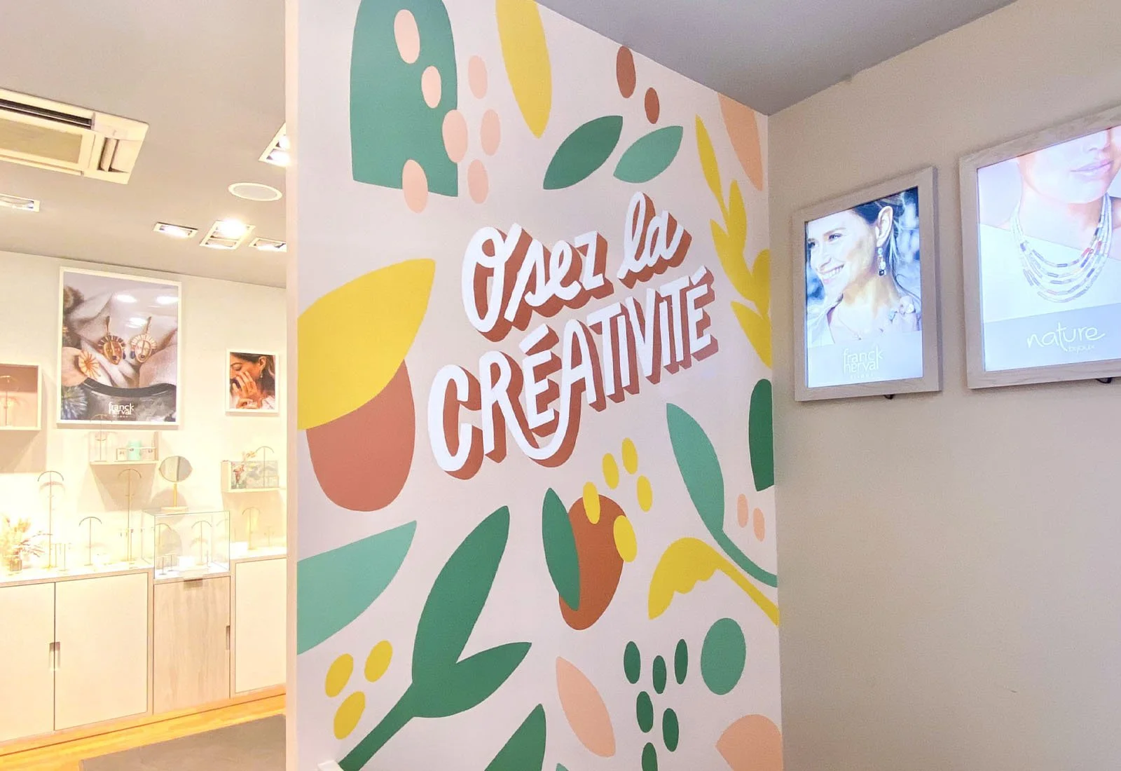 Fresque murale de 1,6 m x 2,7 m créée pour décorer la boutique Olivolga, située à Paris 6ème. Le lettrage 3D vient illustrer le slogan de la marque « Osez la créativité ». Les dessins végétaux habillent les murs de la bijouterie de couleurs chaleureuses. Le design a été transposé sur le mur grâce à des impressions en taille réelle et du papier transfert.