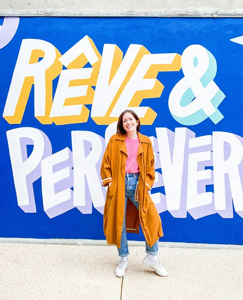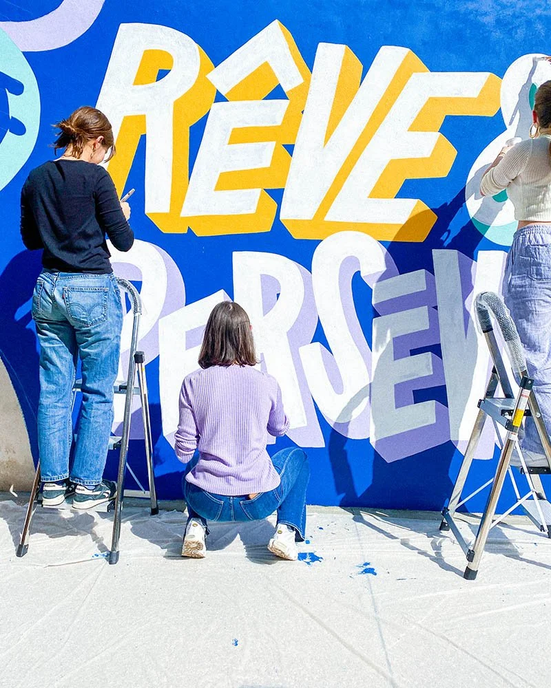 Design créé en collaboration avec les élèves. Le mantra et le logo de l’établissement se mélangent à des illustrations représentant les études. Tout le design a été transféré sur les murs avec un vidéo projecteur. Avril 2022.