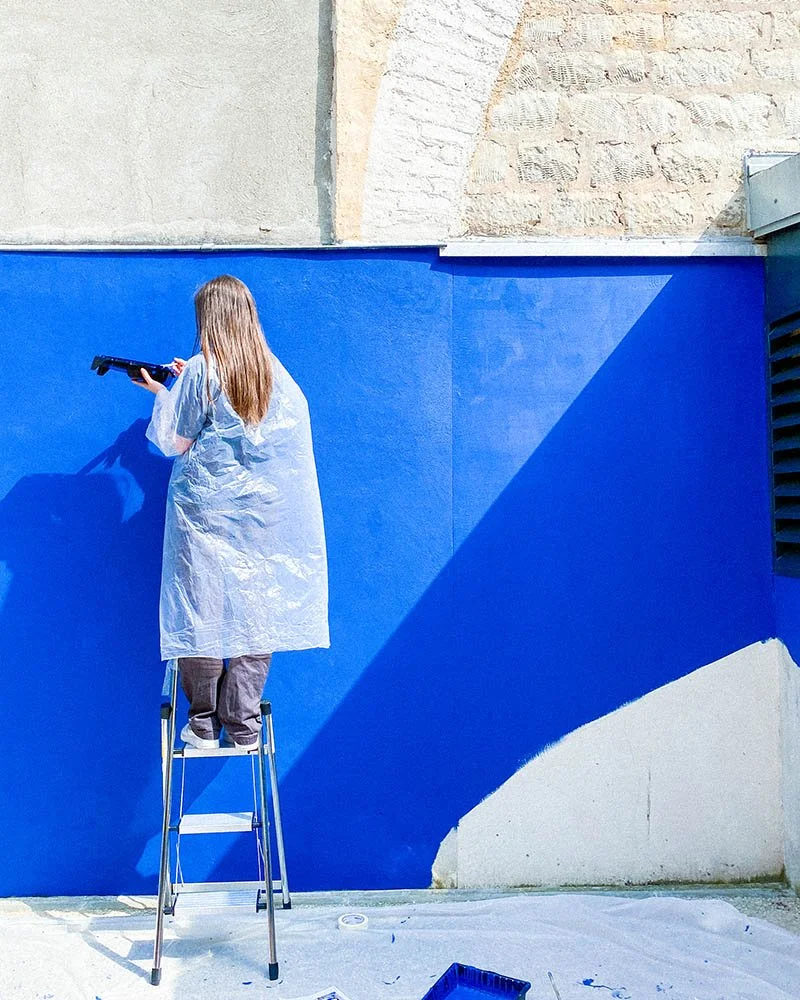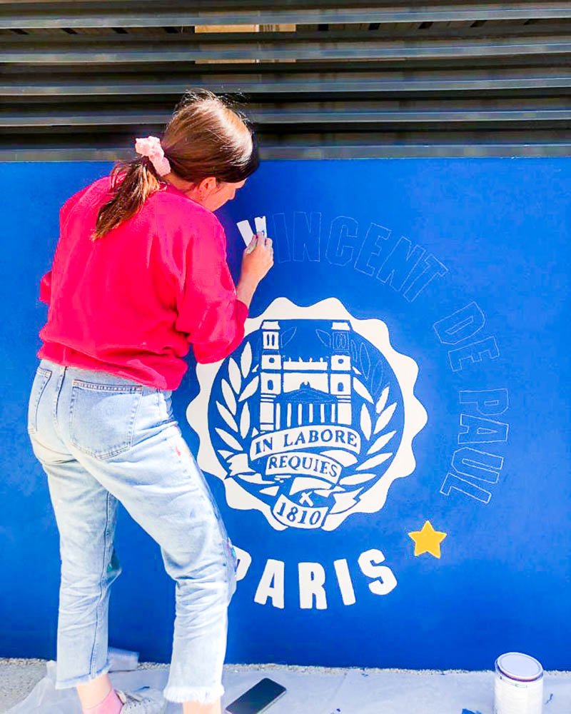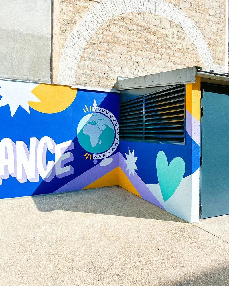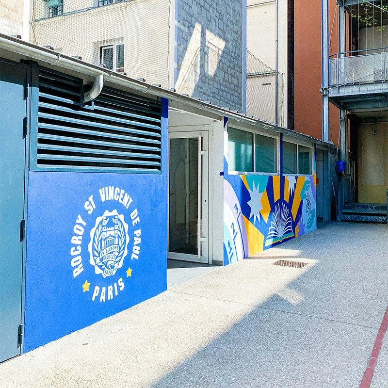 A large 17.5m x 2.5m mural painted on all four main walls of the inner courtyard of Rocroy Saint-Vincent de Paul private school in Paris’ 9th district.