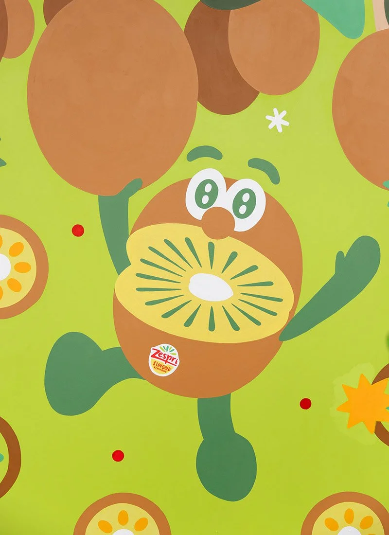 La fresque a été réalisée sous les yeux du public en 3 jours avec l’aide de deux assistantes, avant d’être exposée pendant une semaine. Les contours du design ont été imprimés sur la surface en amont. Ce projet hyper coloré vient compléter les “Kiwis dans les Vergers”, création également réalisée pour Zespri.