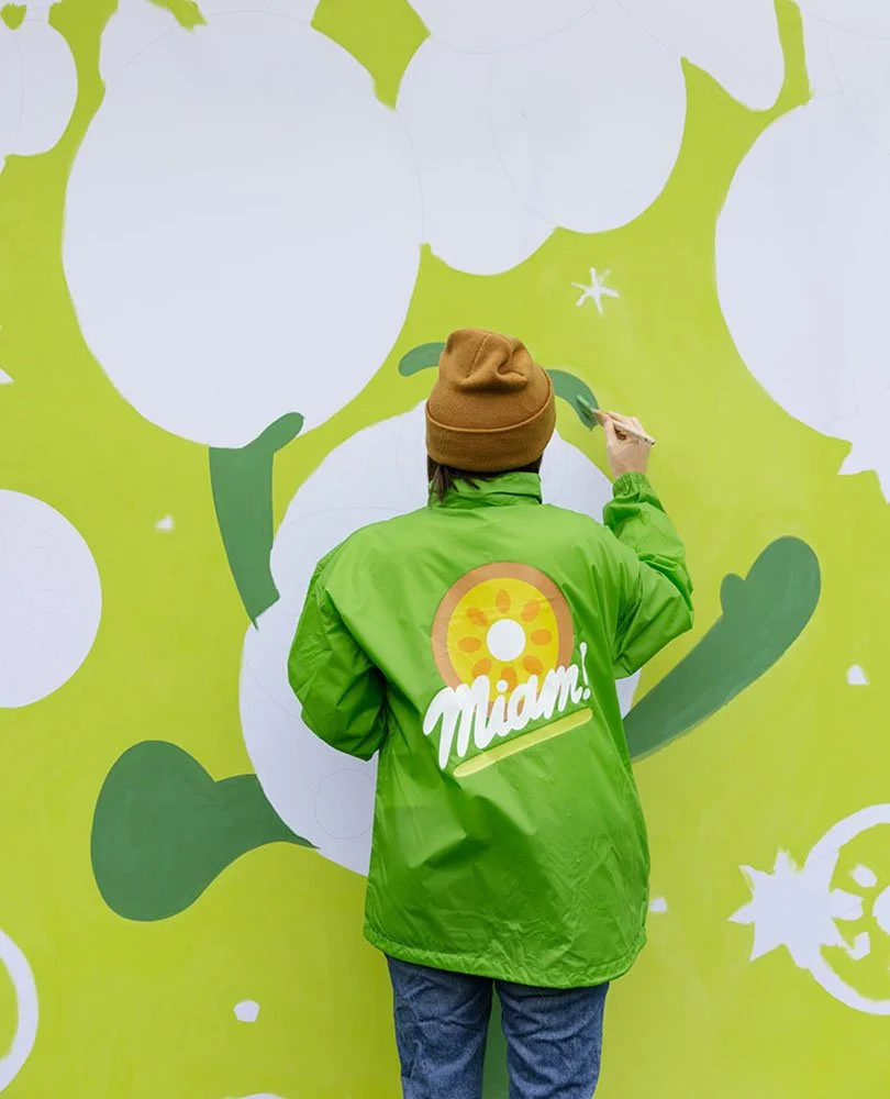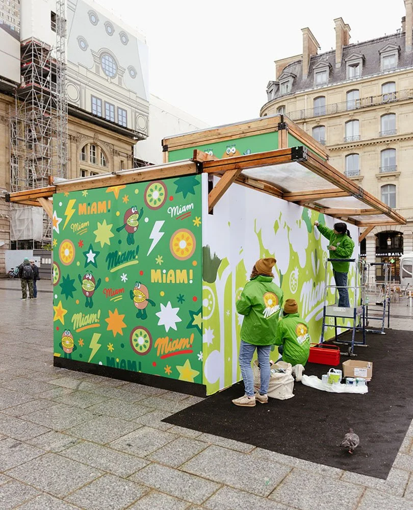 A mural on stretched canvas measuring 7.5m x 2.5m was created as a live painting during an event at the entrance of the Saint-Lazare train station in Paris. The ultra-vibrant and lively illustration is accompanied by dynamic and indulgent lettering. It incorporates brand symbols such as brand mascots and kiwi labels, all hand-painted!
